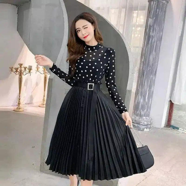 Plisserad midiklänning med prickar och bälte
