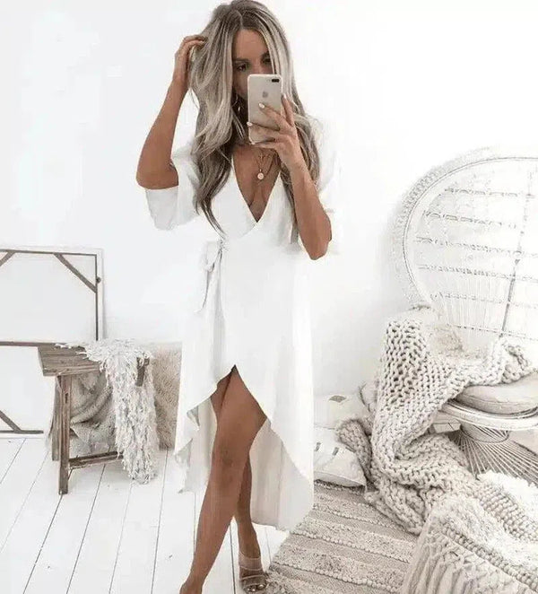 Chic omlottklänning med V-hals och asymmetrisk fåll