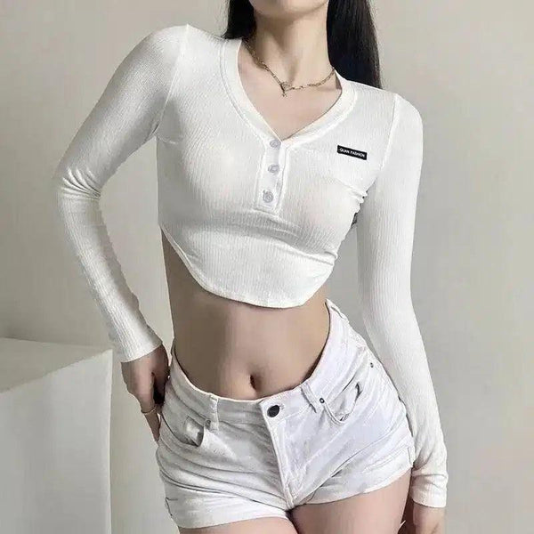 Ribbad Crop Top med knappdetalj för kvinnor