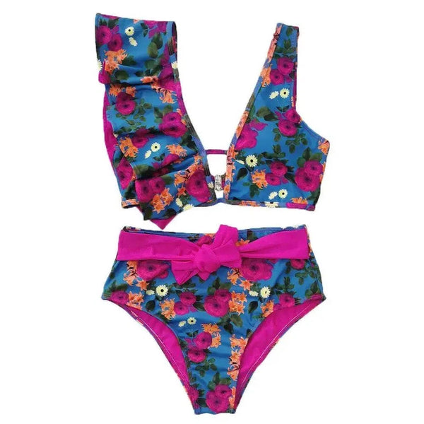 - Style: Asymmetrisk bikini med hög midja och volanger
