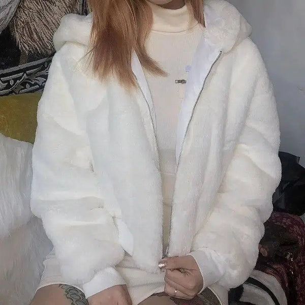 Produktbeskrivning: Avslappnad kort plyschjacka med huva för kvinnor