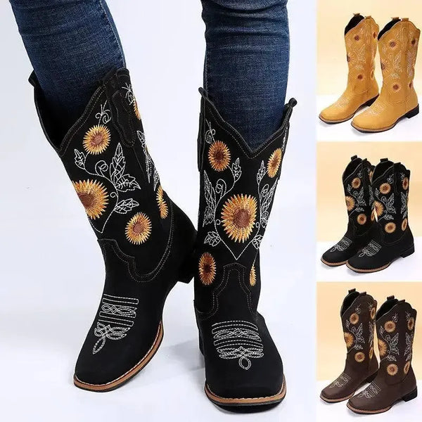 Cowboy Boots Kvinnor Solrosor Broderier Skor Låg Klack