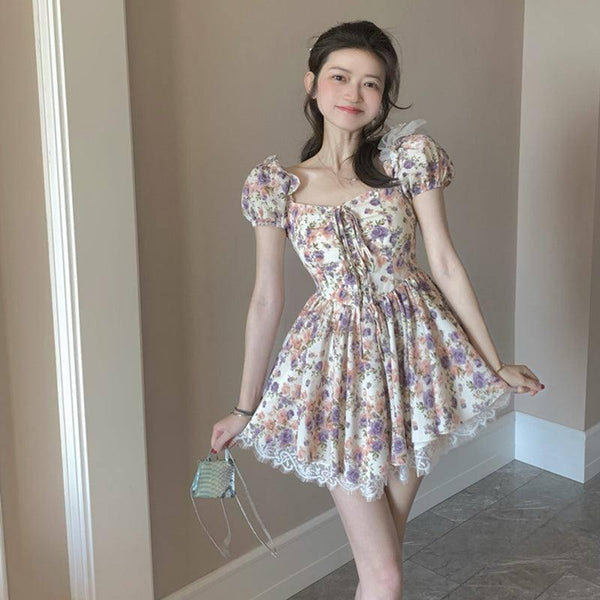 Kortärmad spetsklänning med fransk puffärm för kvinnor