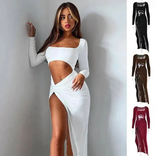 Damkläder Långärmad klänning Mode Hollow U-neck Split Klänning Party Bröllop