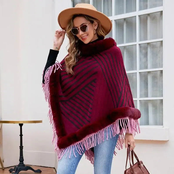 Drizzling Fur Collar Pullover Tassel Stickad Cape För Kvinnor