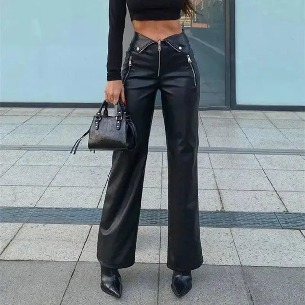 High Waist Straight Loose Wide Leg Casual Byxor Läder