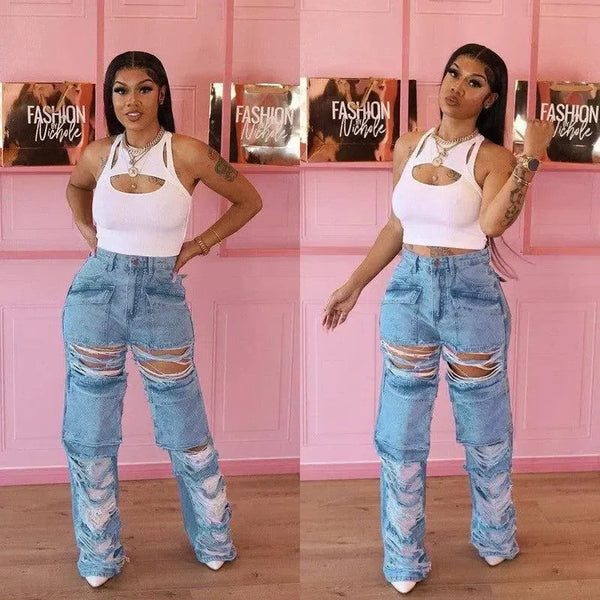 Rippade jeans med hög midja och dragkedja för kvinnor