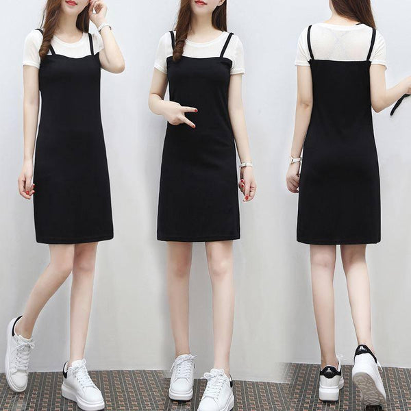 Kortärmad midjelång falsk tvådelad klänning med hängslen sommar