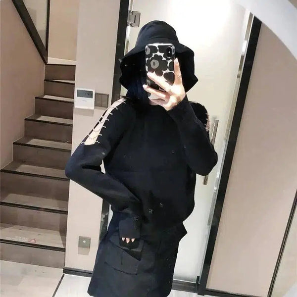 - Halsringning: Hög halsringning med huva