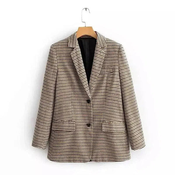 - Classic Houndstooth Blazer: Lyft din garderob med detta tidlösa plagg med ett traditionellt houndstooth-mönster i en neutral färgpalett.