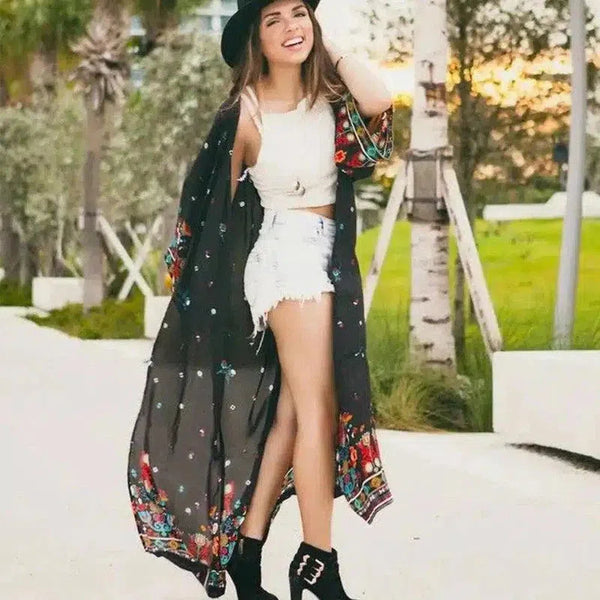 - Typ av plagg: Lång kimono cardigan med öppen framsida, matchande crop top och jeansshorts med hög midja