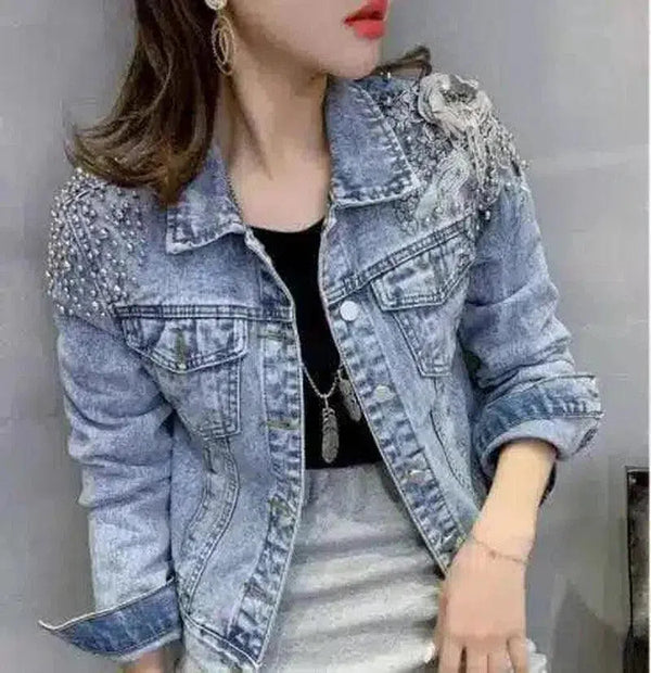 - . Invecklade utsmyckningar: Denna jacka är utsmyckad med gnistrande nitar och intrikata pärlor på axeln och ger ett djärvt uttryck till alla outfits.