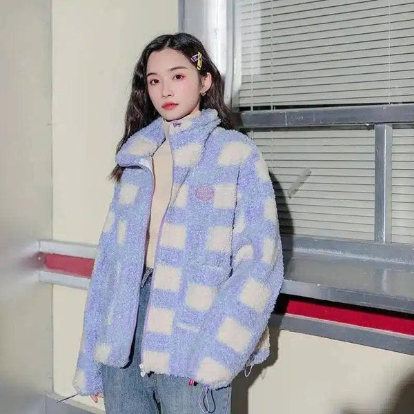 Checkad kavaj i varm ull av imiterat lammsammet för damer