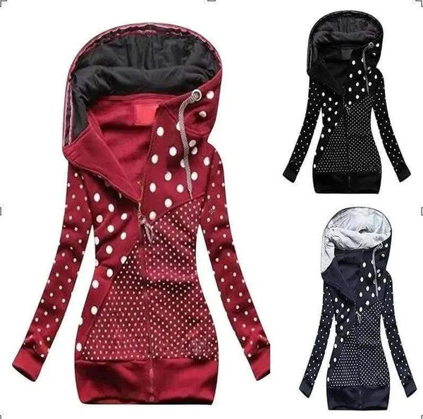 - Chic Polka Dot Hoodie: Få en lekfull men ändå snygg look med denna iögonfallande polkagrisrandiga hoodie, perfekt för att ge din garderob en mönstrad look.