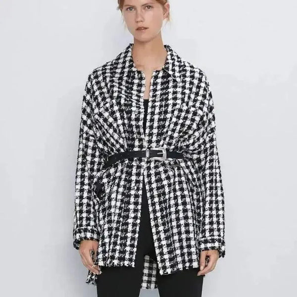 Bältesjacka i houndstooth för kvinnor