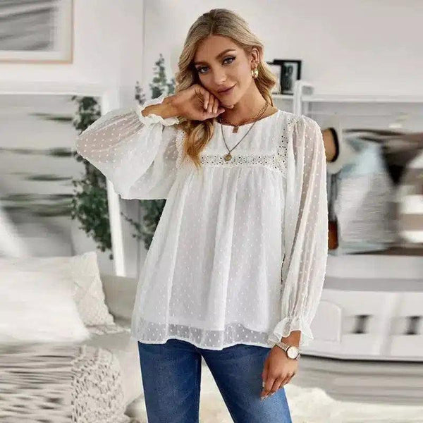 Långärmad skir blus med spetsdetaljer för kvinnor