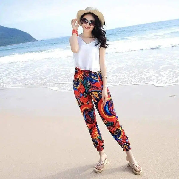 - Typ av plagg: Avslappnad sommaroutfit med en löst sittande topp och byxor med levande mönster