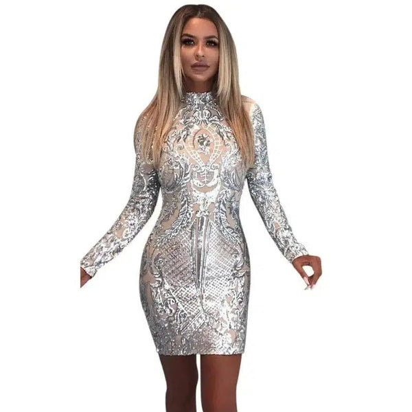 Höghalsad långärmad elegant festklänning med paljetter