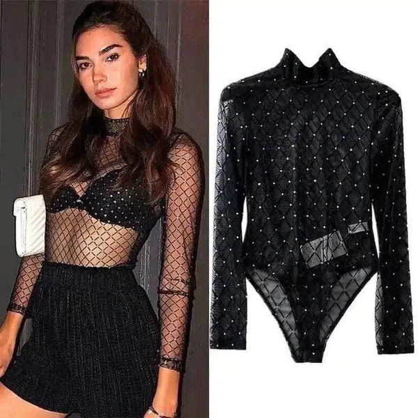 Bodysuit i mesh med utsmyckning och långa ärmar