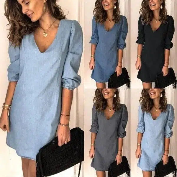 V-ringad, kortärmad, ledig, lös klänning i bomull och linne