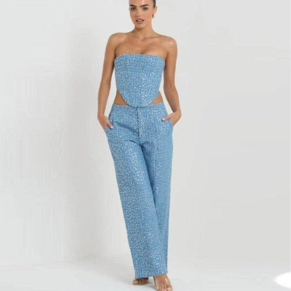 Mode Denim paljettförsedd Tube Top Byxor med vida ben Kostym