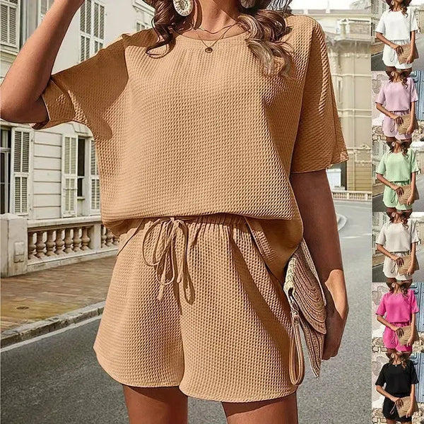 Nya Waffle Suit Women's Bat Sleeve Kortärmad Crew-neck Top och Drawstring Design Shorts Mode Tvådelat Set Sommarkläder