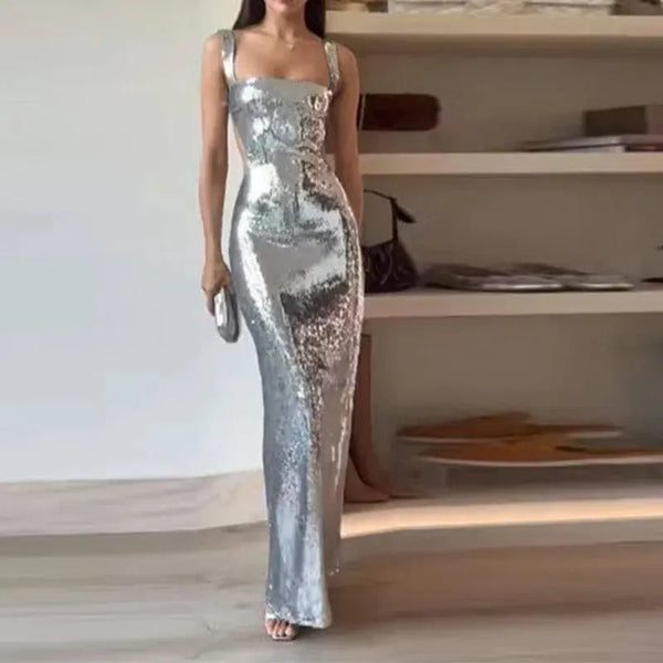 Paljetter Sling Square Collar Backless Klänning Klänning Kjol