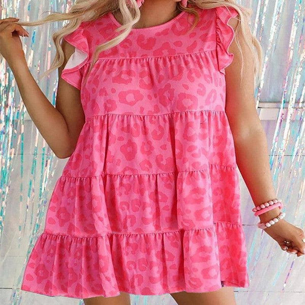 Sommar Leopardmönstrad miniklänning med rund hals och volang