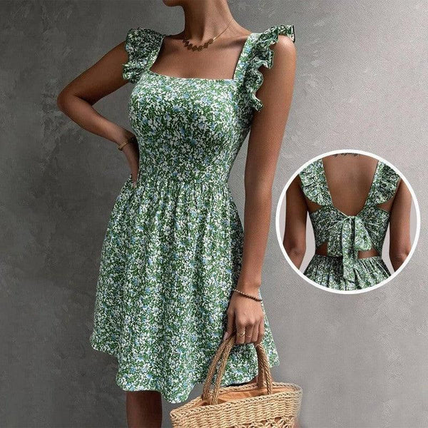 Sommar Fyrkantig halsringning Ruffad ärmlös klänning med fluga