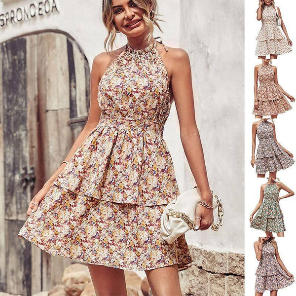 Sommar Tryckt Halter Klänning Mode Boho Backless Ruffled