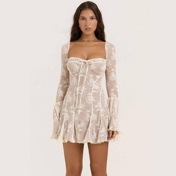Spets klänning med fyrkantig krage Klockren långärmad klänning med knytband A-linje klänningar Damkläder