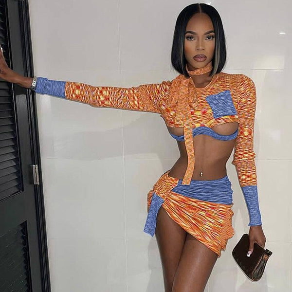 Stickad Långärmad Croppad Topp Smal Kjol Kostym