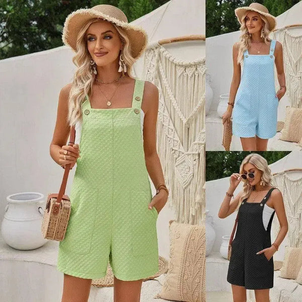 Sweet Waffle Jumpsuit Flickor Sommar Ärmlös Knapp Design Rak Solid Färg Overaller Mode Damkläder