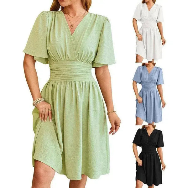 V-ringad kortärmad klänning Mode klockärmad klänning Sommar Damkläder